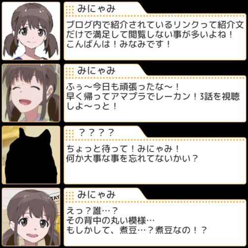 本記事は「Wake Up, Girls! Advent Calendar 2020」9日目の記事になります。 adventar.org 登場人物紹介 ・みにゃみ 片山でも田中でもない第3のみにゃみ。アニメWUGのキャラクターとは一切関係が無い普通の女の子。最近レーカン!を視聴し始めた。 ・煮豆 …