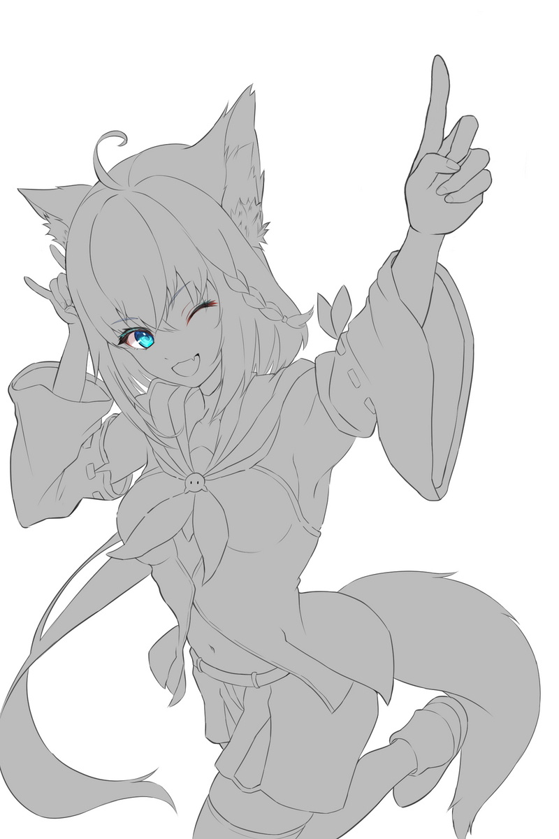 ポージングとしては足を上げた事でキャラクターがどんなポーズかかなりわかりやすくなりました。尻尾や髪の毛も描き直した事で平面的で単調な印象から動きが付いたような感じになりました。